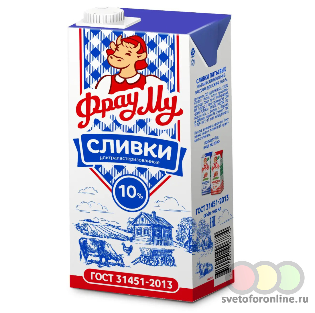 Сливки питьевые ультрапастеризованные Фрау МУ 10% ГОСТ 31451 2013 1л БЗМЖ Дары Молока ООО(производит - Купить в магазине "Светофор" город Киров Калужской области, ул.Пролетарская, 189